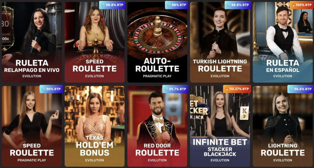 La sezione live offre tavoli con croupier reali 24/7, inclusi game show come Lightning Roulette, Monopoly Live o Crazy Time. Provider principali: Evolution Gaming e Pragmatic Play Live. Interazione via chat e qualità HD.